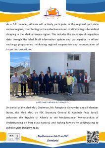 The Secretariat of the Mediterranean Memorandum of Understanding on Port State Control (Med MoU) is pleased to announce the formal accession of the Republic of Albania as a full member. This significant step follows the successful completion of a comprehensive audit process and the subsequent unanimous acceptance by the Med MoU Committee.